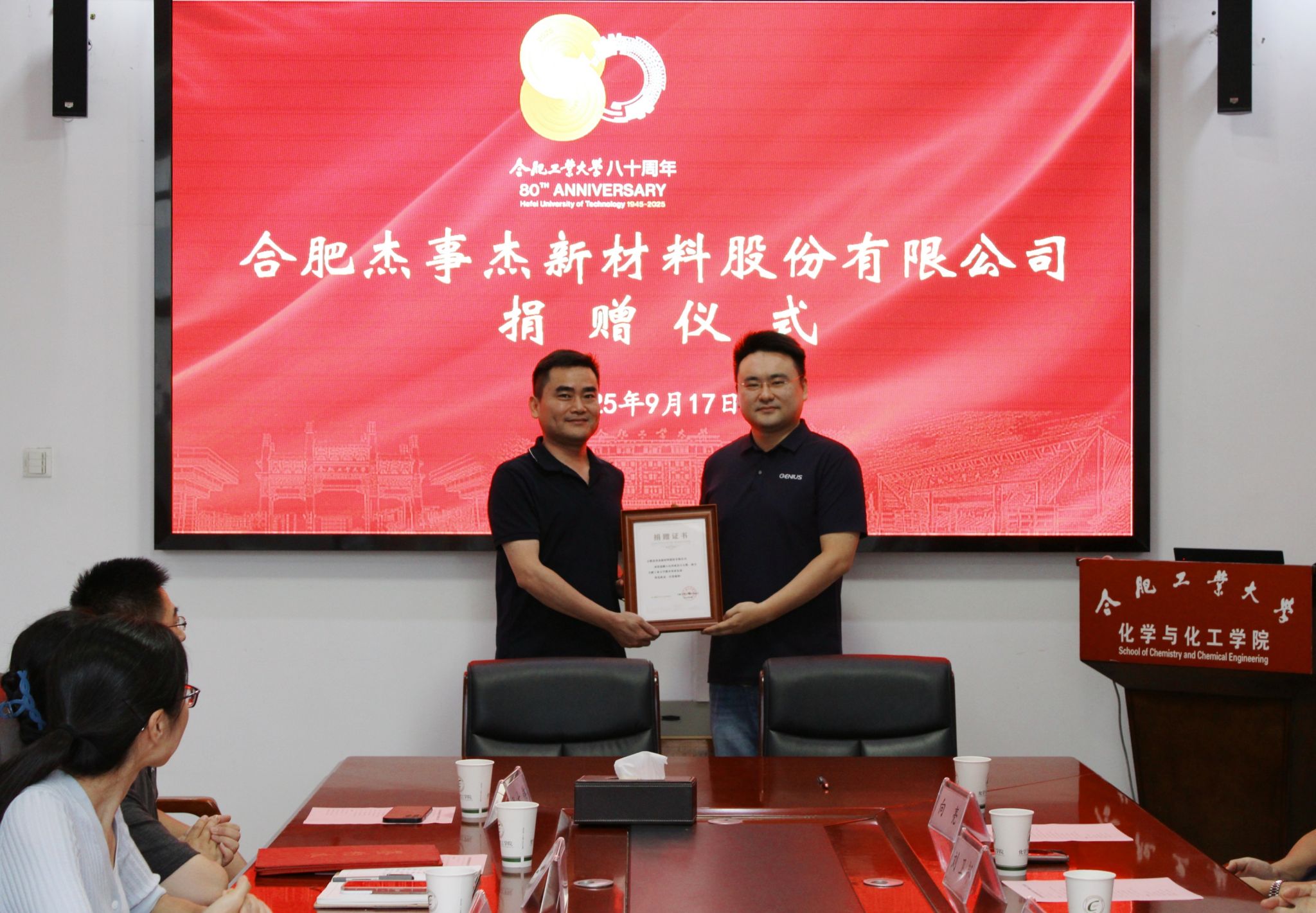在学校八十周年校庆即将来临之际,合肥杰事杰新材料股份有限公司向学校捐赠人民币200万元,用于支持学校事业发展和人才培养。9月17日下午,学校举行捐赠仪式,校党委副书记严福平,合肥杰事杰新材料股份有限公司董事长、总经理杨刚出席仪式。仪式上,严福平向杨刚颁发了捐赠证书,对合肥杰事杰慷慨捐资支持学校发展的善...