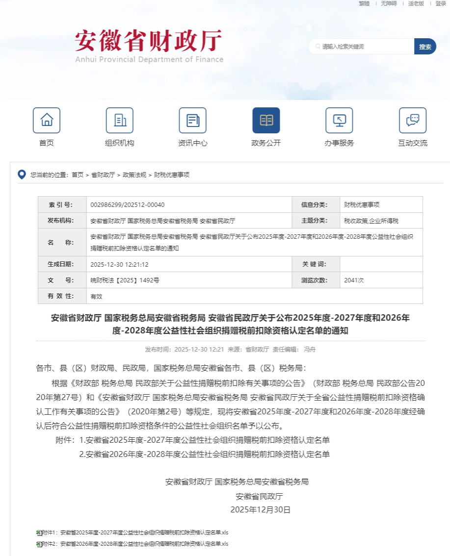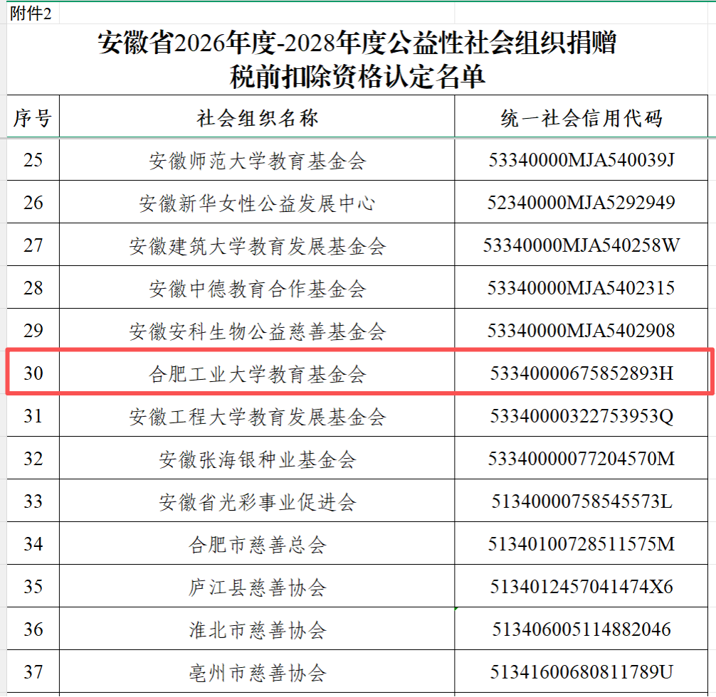 2025年12月30日,安徽省财政厅 国家税务总局安徽省税务局 安徽省民政厅联合发布了《关于公布2025年度-2027年度和2026年度-2028年度公益性社会组织捐赠税前扣除资格认定名单的通知》〔2025〕1492号,合肥工业大学教育基金会获2026年度至2028年度公益性社会组织捐赠税前扣除资格。